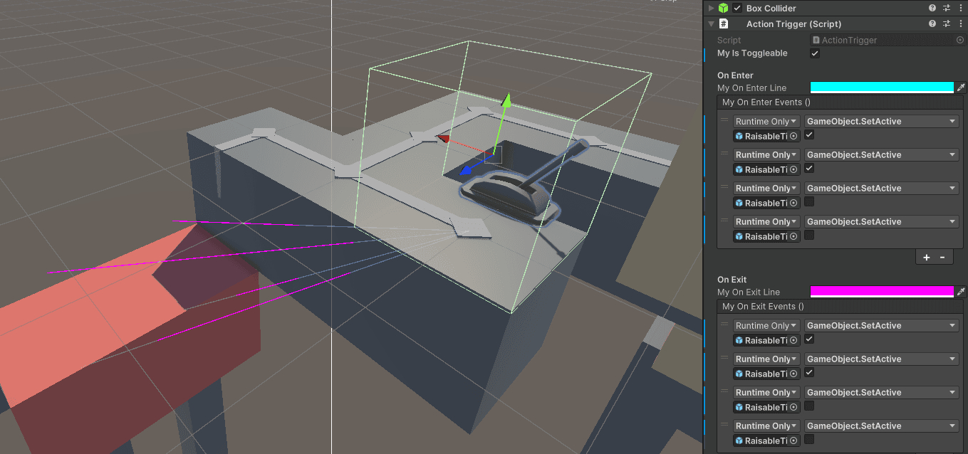 I created a script which let our level designers trigger Unity events when the player steps inside a trigger volume. It’s a very simple concept, but it made iterating on levels and mechanics way easier.