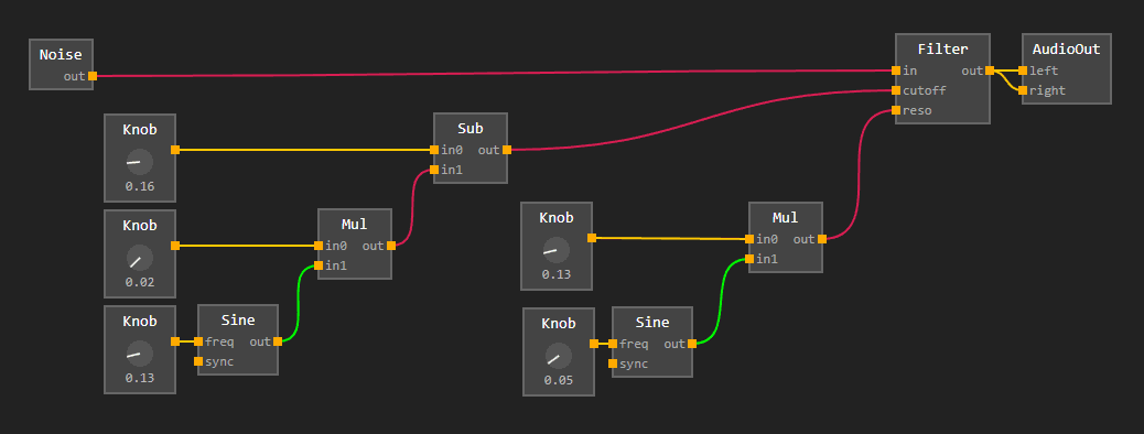 Noise and filters alone are enough to make a basic wind sound, but there’s a reason I added sine waves to the graph; the sounds becomes way more alive because of the variation they add.