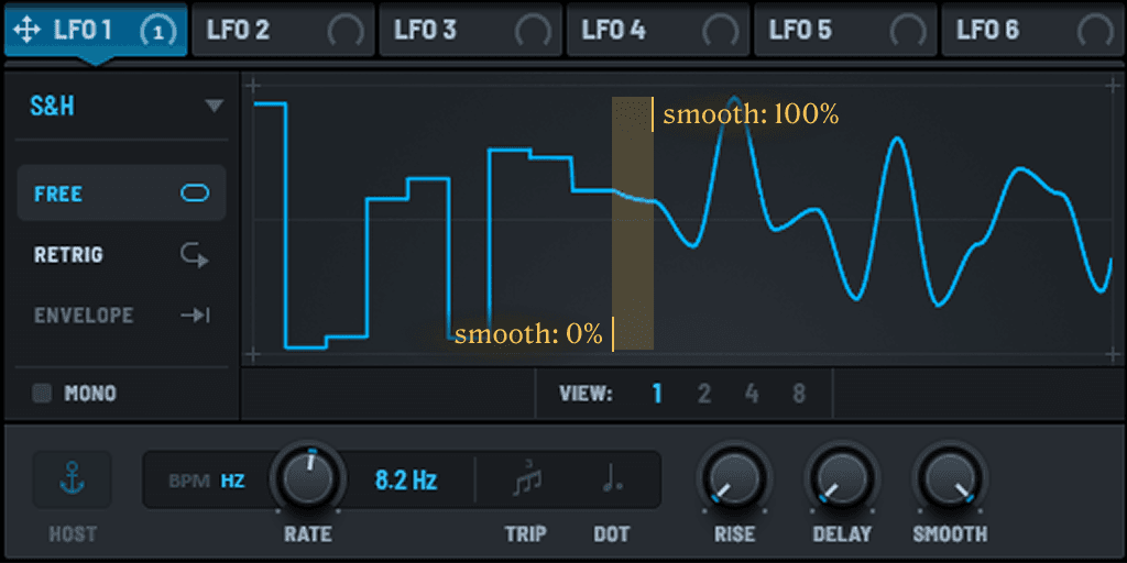The simplest way is via an LFO, which is basically just a sine wave, but it still isn’t enough. I played around in my DAW and discovered S&H (Sample and Hold). It samples a value from an input signal (in this case, noise) at a certain rate, and holds that value until the next sample is taken.
