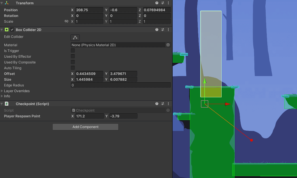 Checkpoints are necessary to ensure players don’t have to replay an entire level when defeated. Like all other world interactions, checkpoints were also triggered by trigger zones. Each checkpoint has a set respawn position, so if the player dies after reaching a checkpoint, they would respawn at that position.